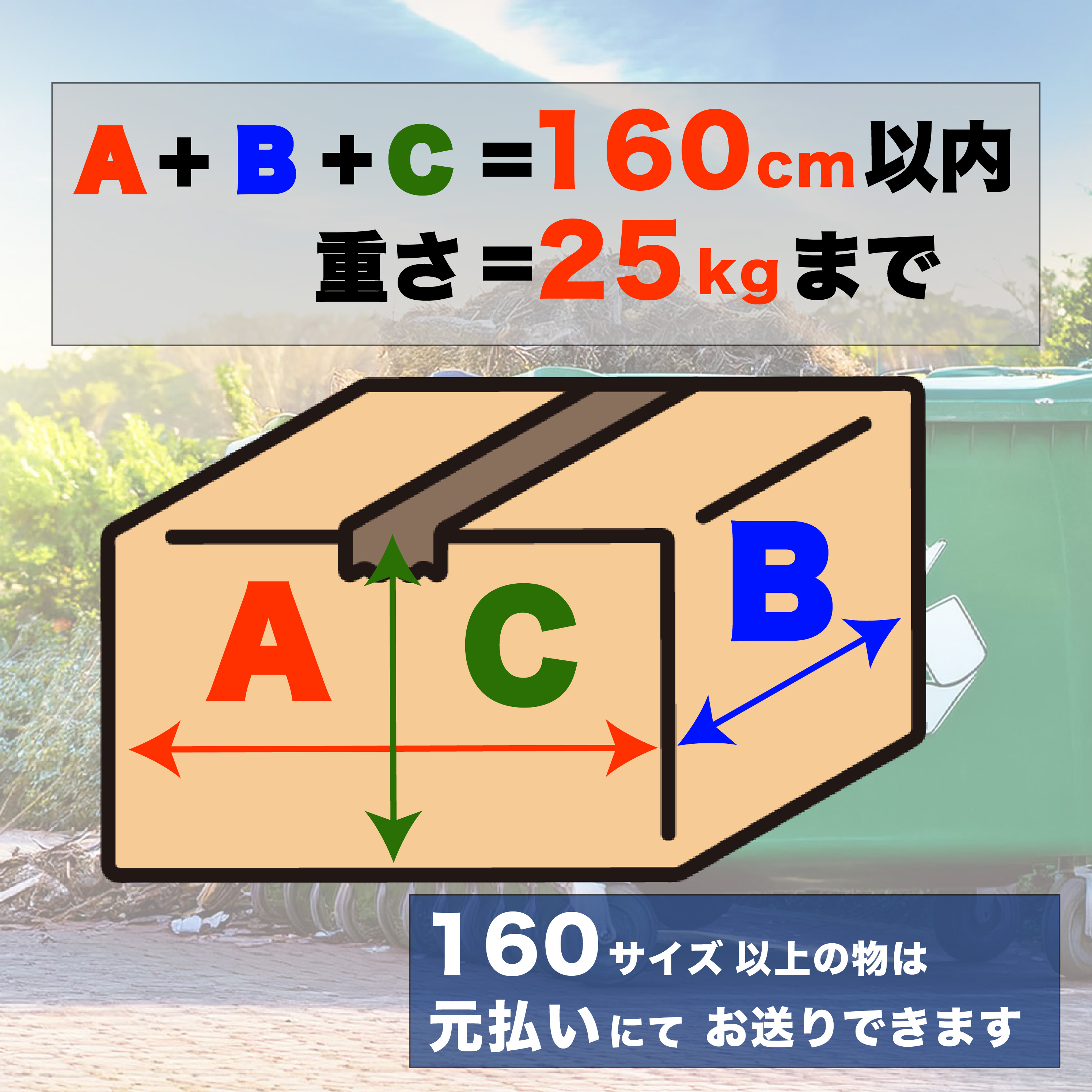 1箱の目安は「160サイズまで」荷物の大きさ「160cm以内」重さ「25kgまで」